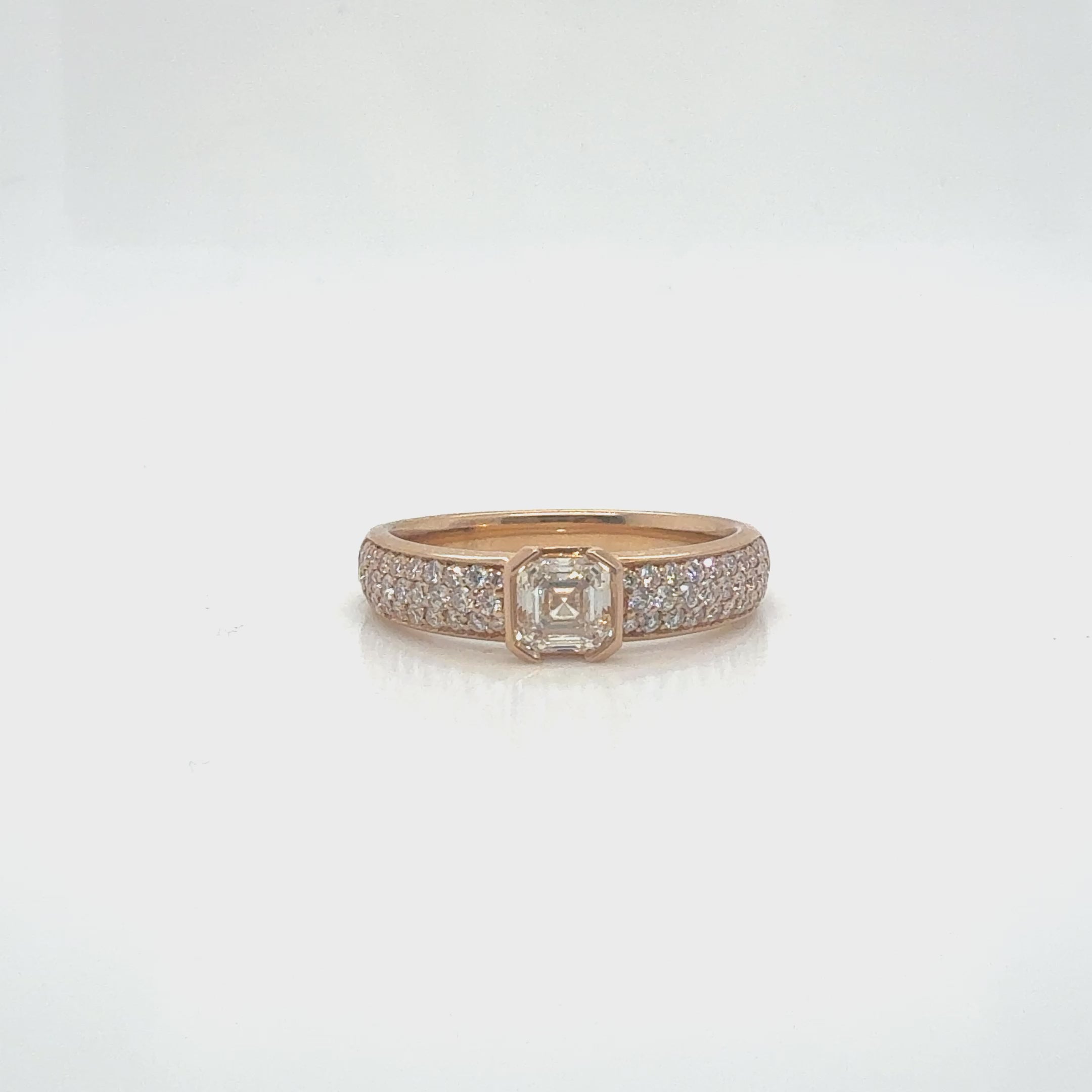 Crafted in warm 18K rose gold, this exquisite ring centers on a striking Asscher-cut diamond, renowned for its captivating step-cut facets and vintage-inspired appeal. The center stone is beautifully complemented by a pavé-set half-way shank, adorned with sparkling round brilliant diamonds that enhance the ring’s radiance while maintaining a refined balance of brilliance and warmth.