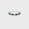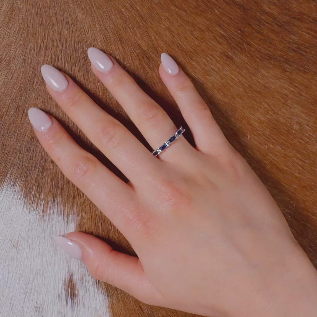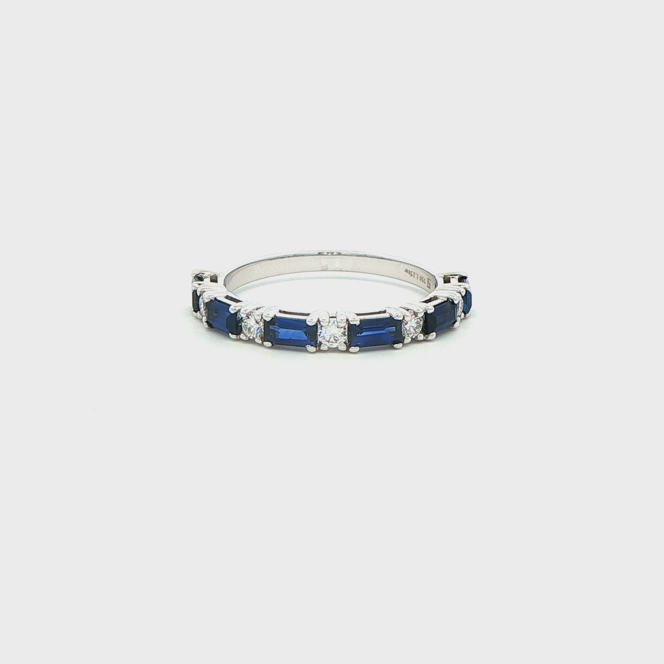 The step cut sapphires deliver sleek, structured color, while round diamonds add flashes of brilliance between each section. A distinctive eternity band that blends modern lines with classic gemstone contrast.