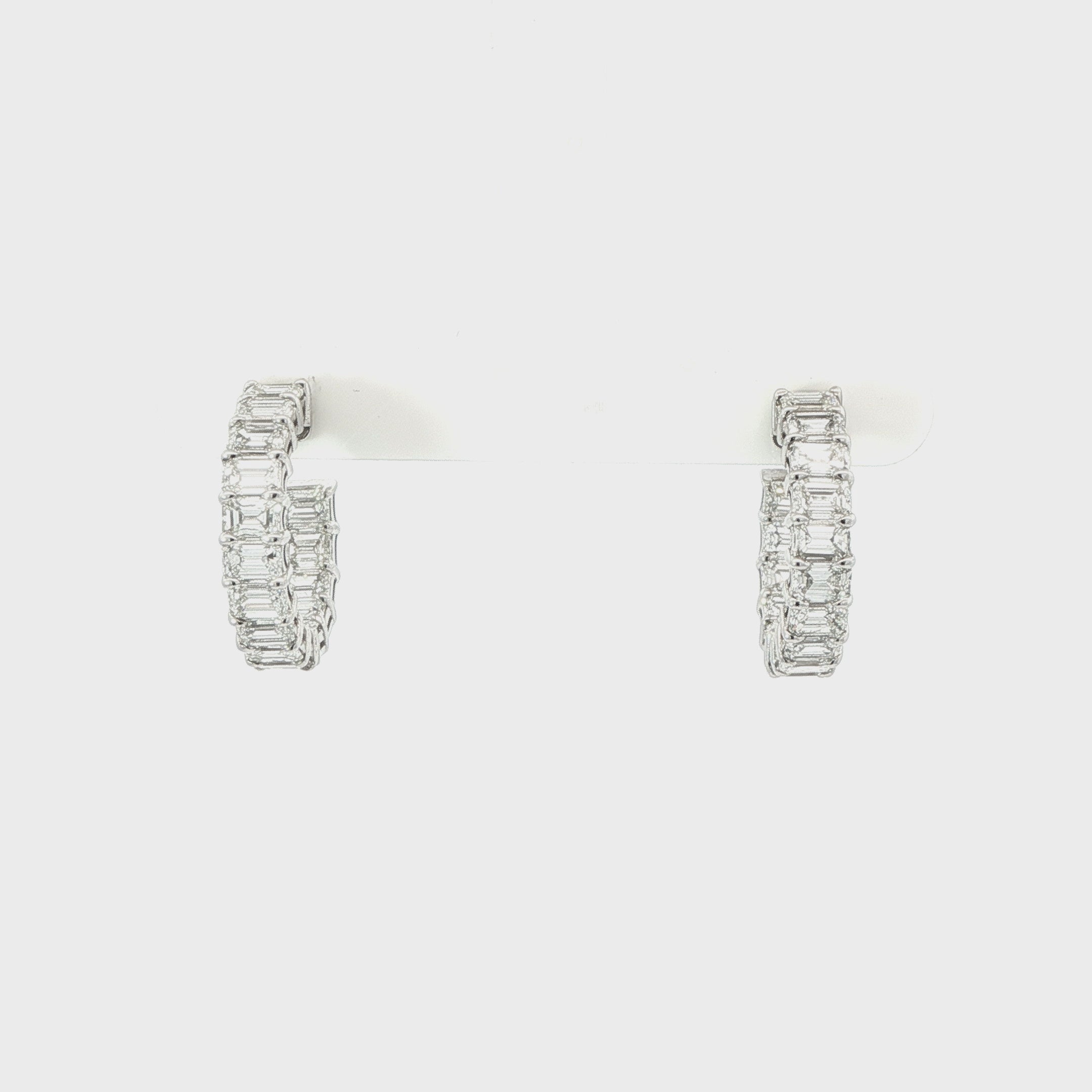 Bold and architectural, these diamond hoop earrings feature a continuous row of emerald cut diamonds set in luminous white gold. The elongated step cut facets create refined, mirror like flashes of light with sophisticated high jewelry presence.