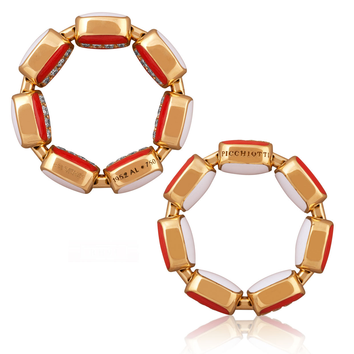 A bold fusion of color and craftsmanship, this Picchiotti Xpandable™ ring features a dynamic combination of red coral, white ceramic, and brilliant diamonds. Crafted in 18K rose gold, the design showcases 14 sections of vibrant red coral and 7 sections of sleek white ceramic, separated by sparkling round diamonds. Picchiotti’s signature expandable mechanism ensures a seamless, comfortable fit, marrying elegance with modern innovation.