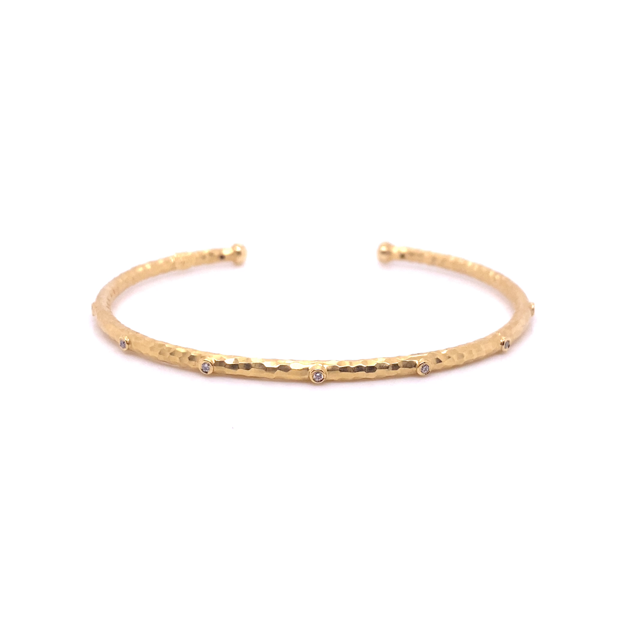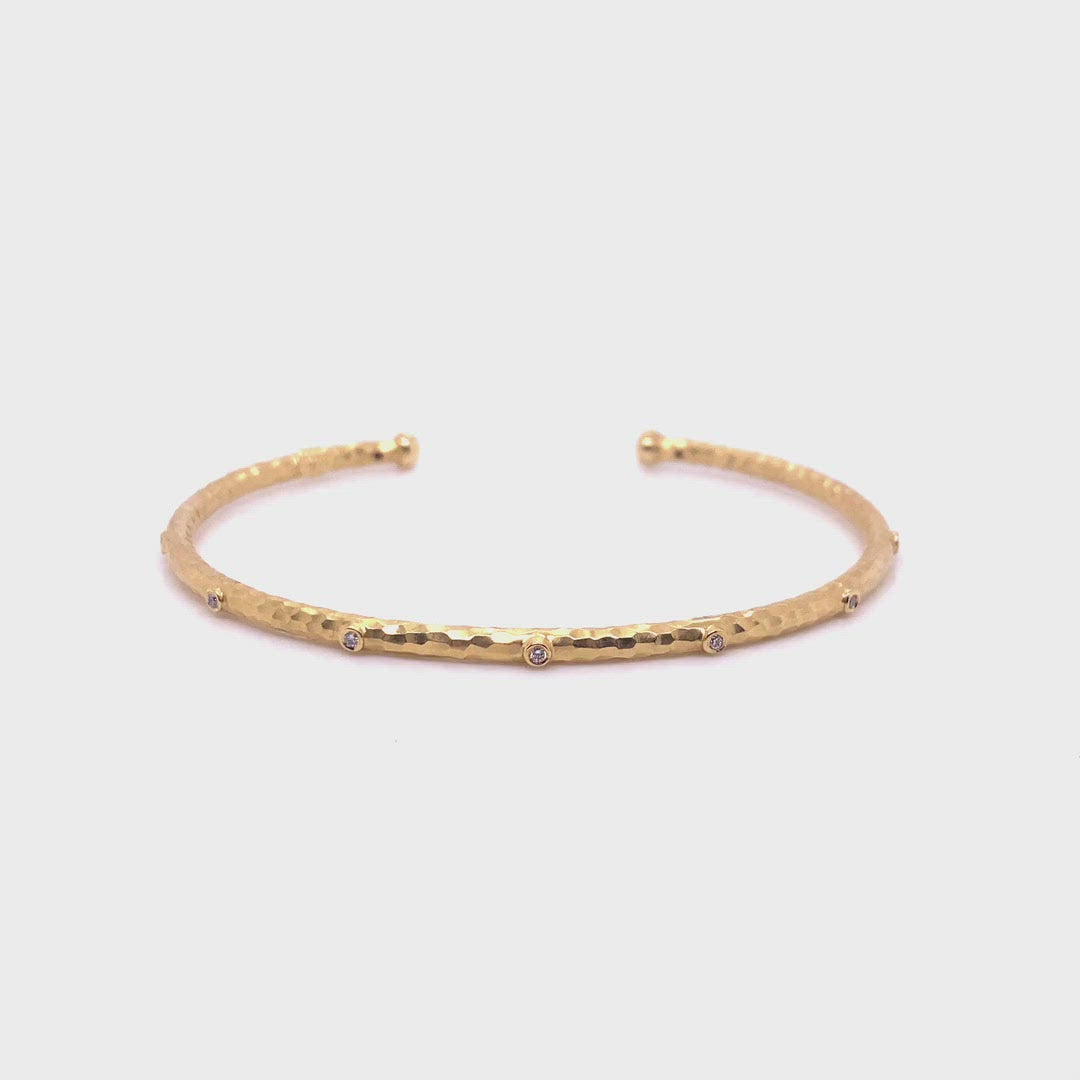 A delicate, artisan hammered gold design, emblazoned with bezeled white diamonds, wraps around the wrist, providing its wearer with the ideal blend of sophistication and whimsy.