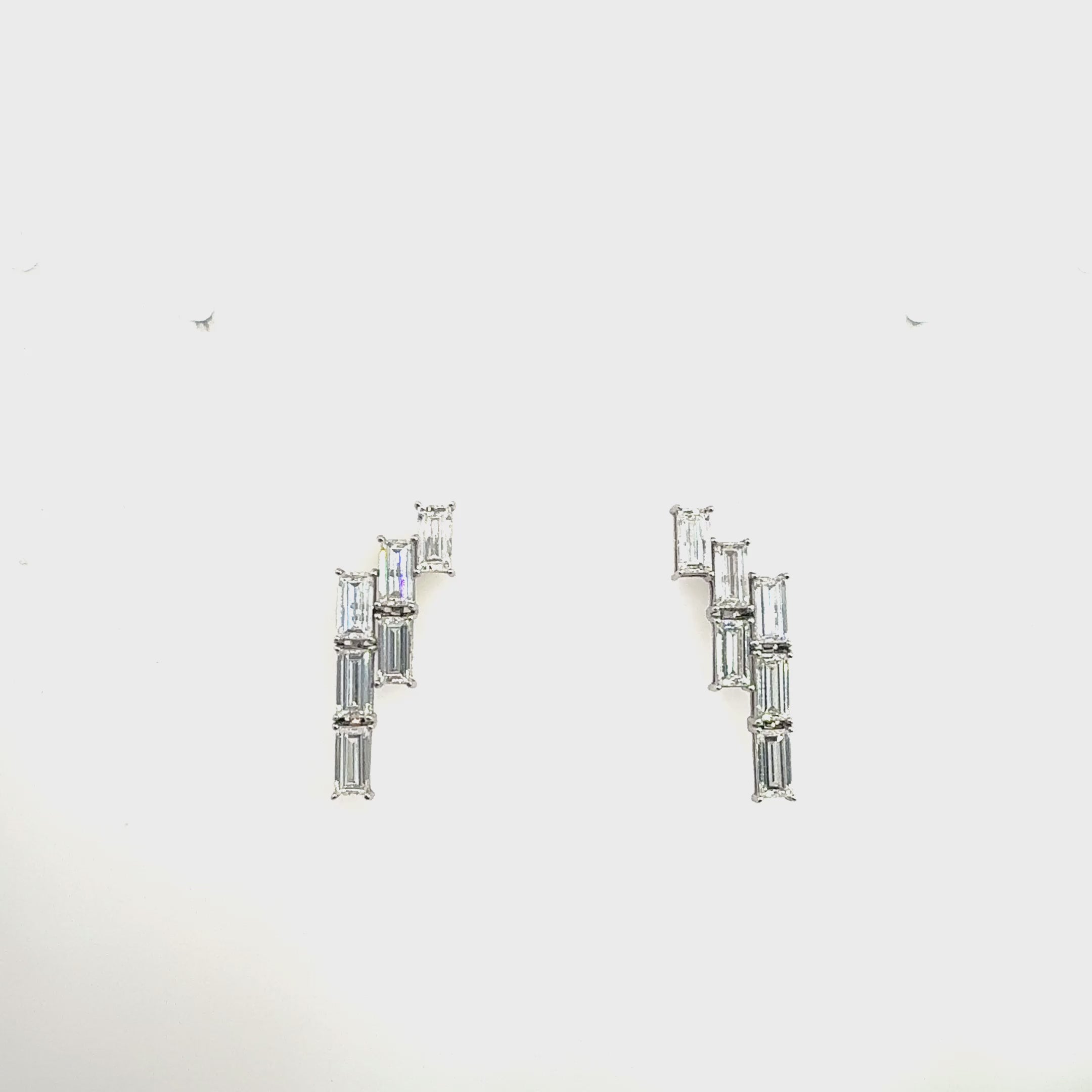 Crafted in luminous 18K white gold, these elegant earrings feature 2.52 carats of expertly set baguette-cut diamonds, chosen for their ultra-fine D–E color and superior VS1–VS2 clarity. The geometric precision of the baguette cut offers clean, modern brilliance with understated sophistication.