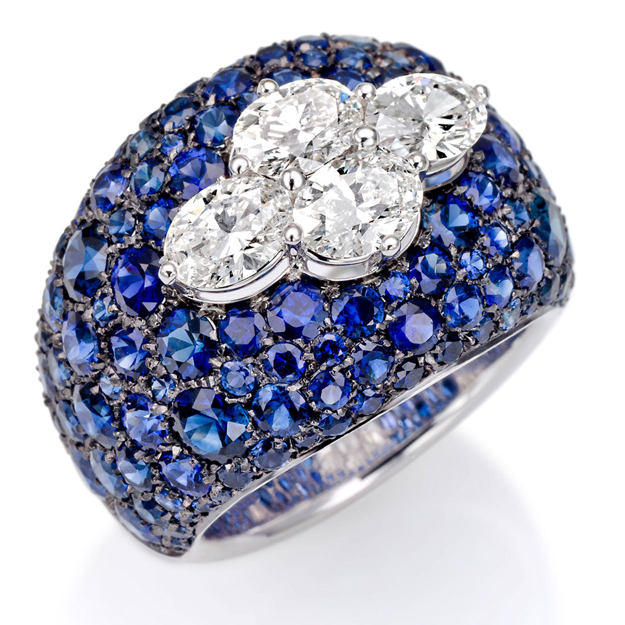 A vibrant combination of blue sapphires and white diamonds, this ring radiates timeless beauty and bold sophistication perfect for collectors who love standout design.