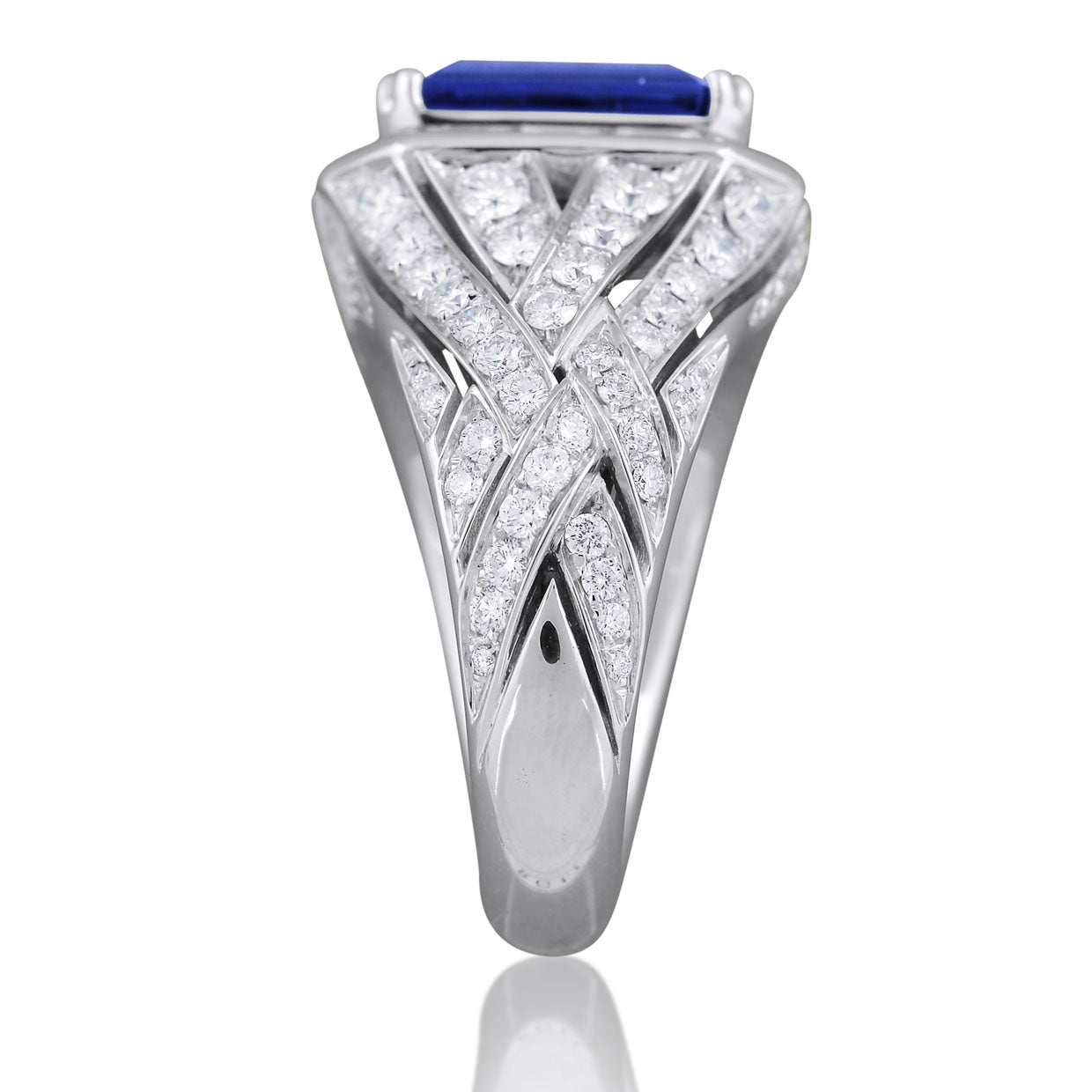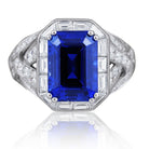 Indulge in a masterpiece of color and craftsmanship with this Picchiotti Emerald-Cut Tanzanite and Diamond Ring. At the center sits a breathtaking emerald-cut deep blue tanzanite—renowned for its rarity and captivating hue. A halo of 117 brilliant round diamonds surrounds the center stone, adding extraordinary sparkle and depth. Meticulously set in 18K white gold, this ring is a statement of timeless sophistication and high jewelry artistry.