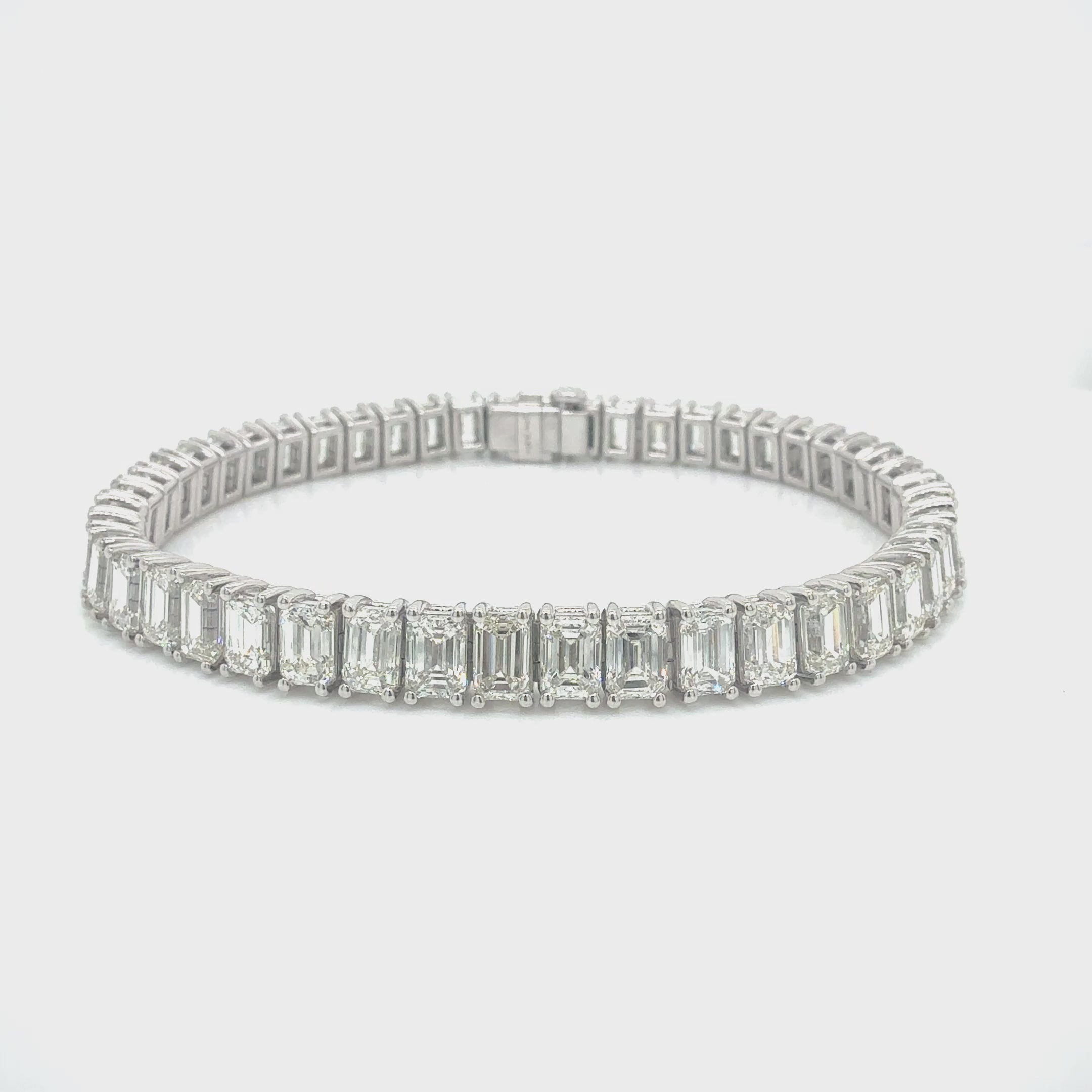 Make a statement with this platinum tennis bracelet, featuring 48 emerald-cut diamonds totaling 18.82 CTTW. The classic prong-set design creates a continuous line of brilliance, showcasing timeless elegance and sophistication. Perfect for special occasions or for adding a luxurious touch to your everyday look.