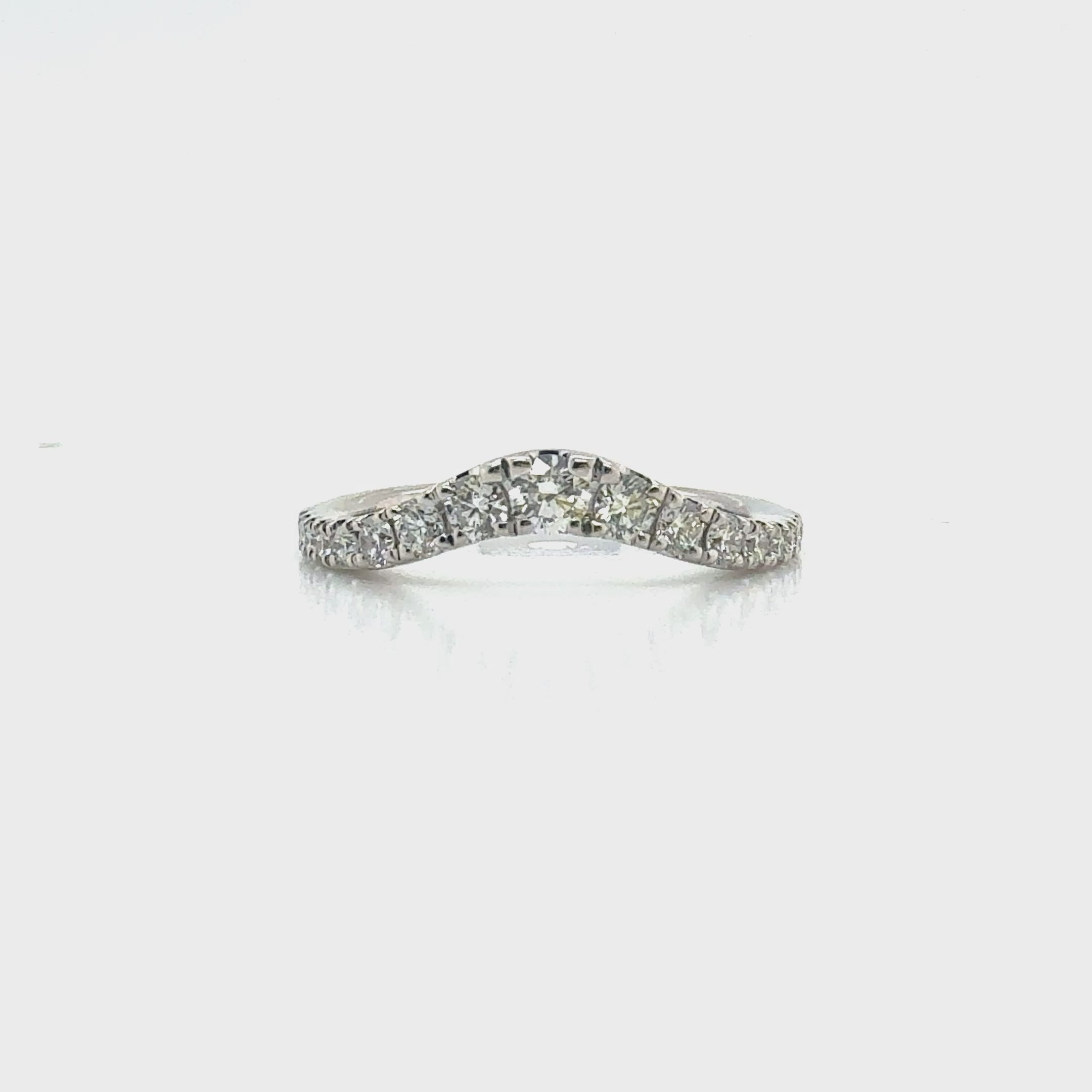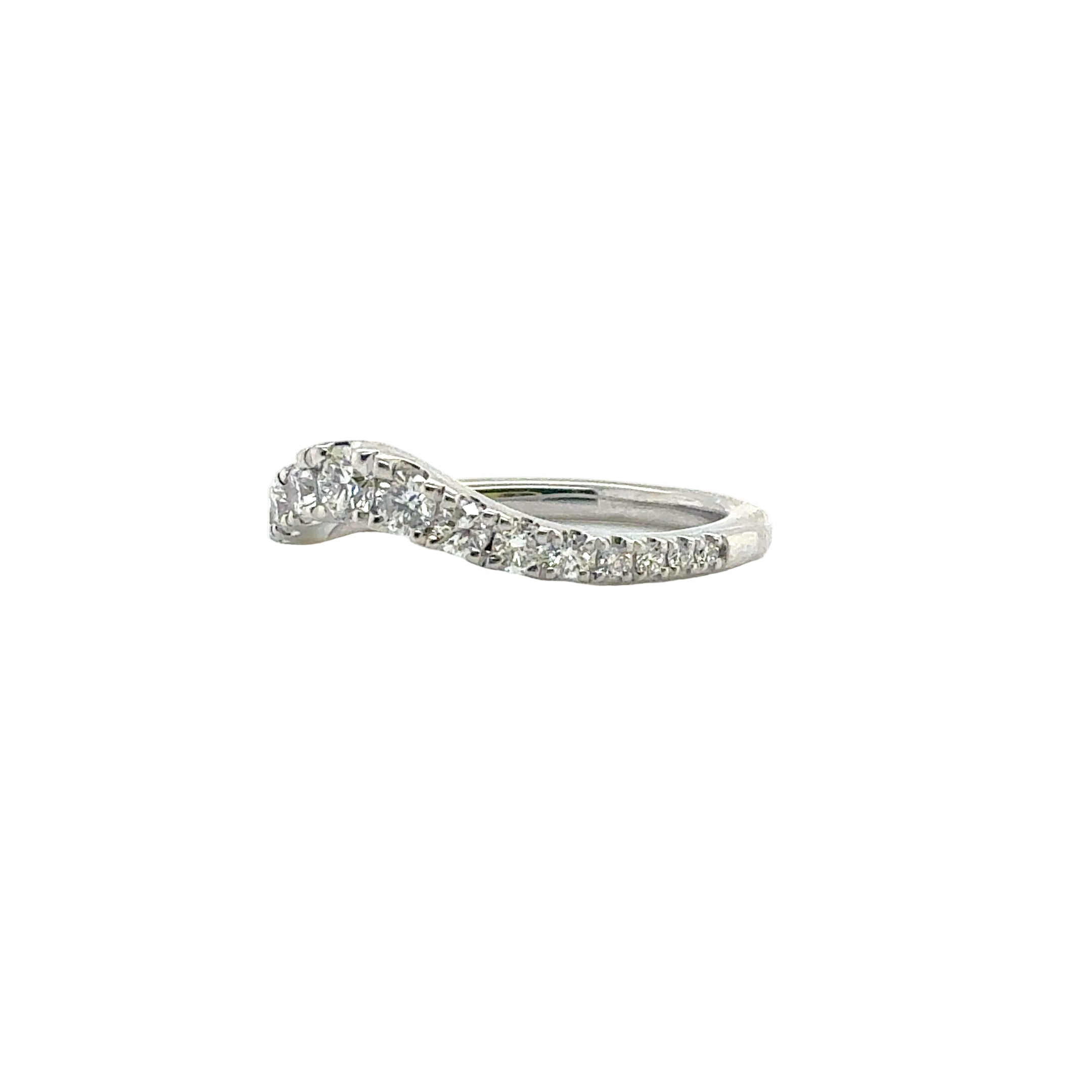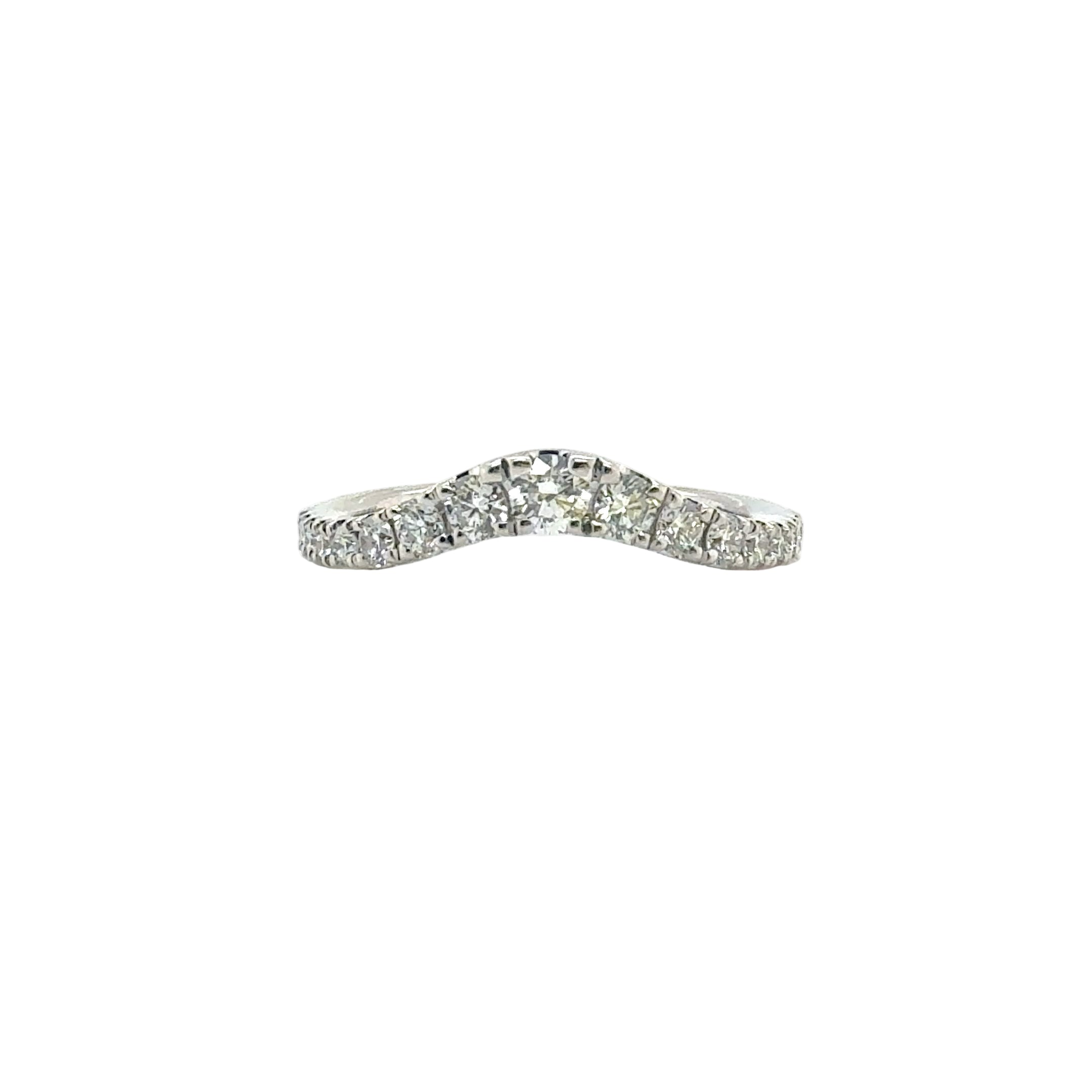 The graceful curve of the design allows it to pair beautifully with an engagement ring or shine on its own as a statement of understated luxury.