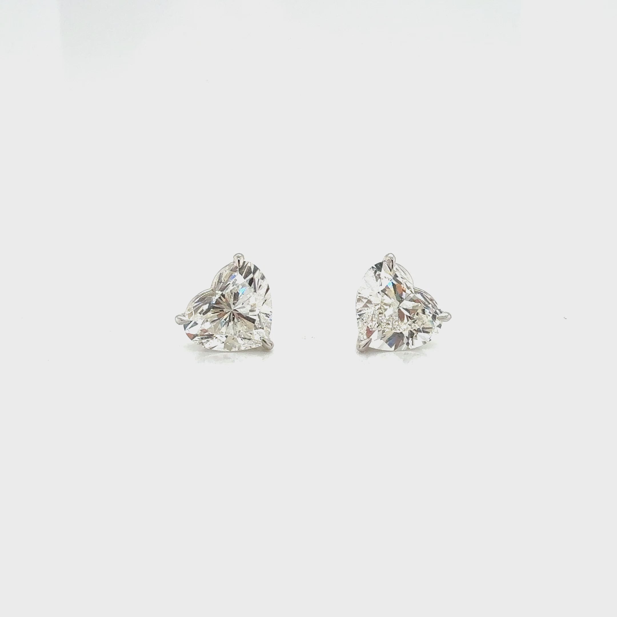 One stud features a 3.01-carat heart-shaped diamond, graded G color / SI1 clarity, with Excellent polish and symmetry and faint fluorescence. The other displays a 3.03-carat heart-shaped diamond, graded G color / SI2 clarity, also with Excellent polish and symmetry and faint fluorescence. Together, they create a harmonious pairing with unmatched romance and radiance.