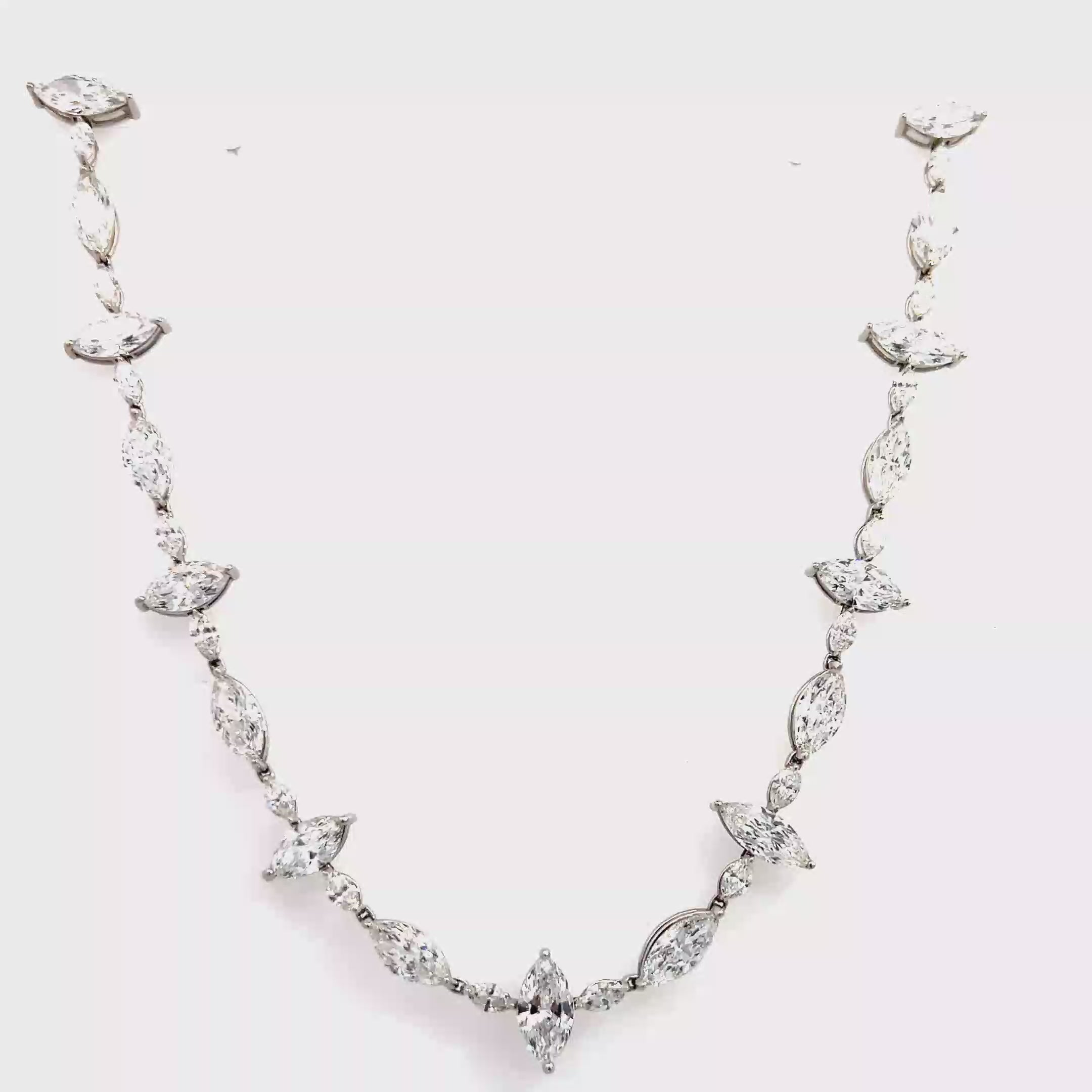 This breathtaking 18K White Gold Necklace is an extraordinary expression of elegance and craftsmanship, adorned with marquise-cut diamonds in a graceful graduated design. With a dazzling total weight of 15.95 carats, this piece commands attention with its sculptural silhouette and exceptional sparkle. Length is 16.5 inches.