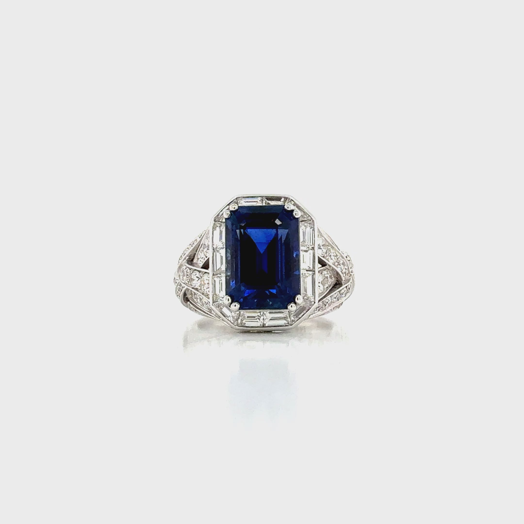 - Center Stone: 6.90ct Vivid Blue Sapphire (Sri Lankan origin, unheated – Dunaigre certified)