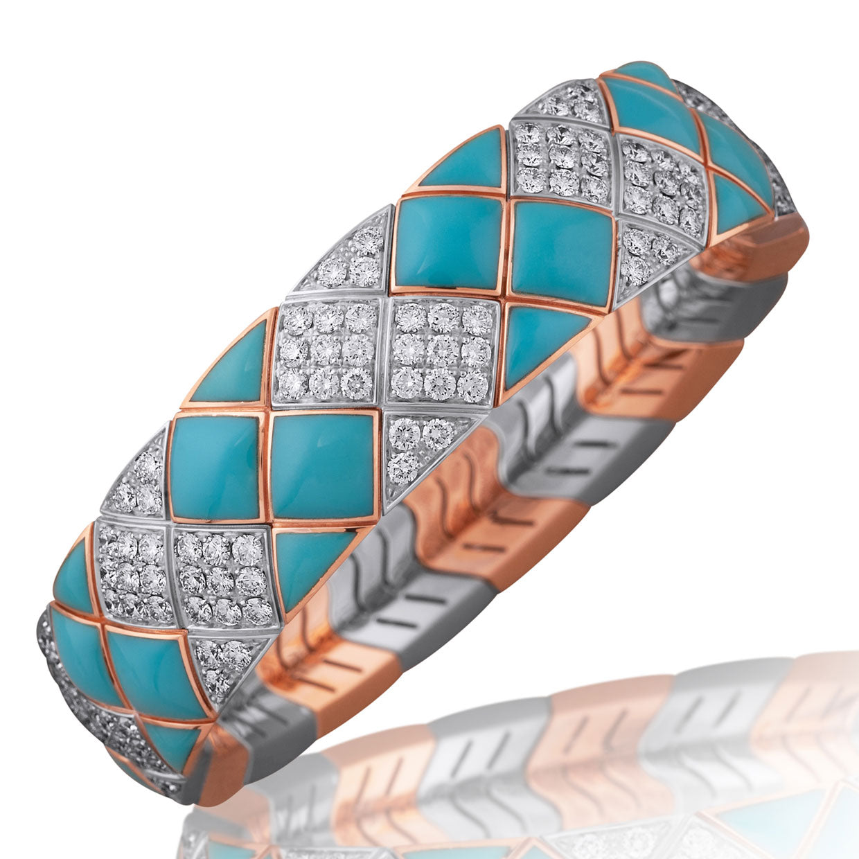 An extraordinary bracelet that blends timeless Italian craftsmanship with modern innovation. The luminous turquoise and sparkling diamonds offer eye-catching contrast, while the flexible fit ensures effortless luxury.