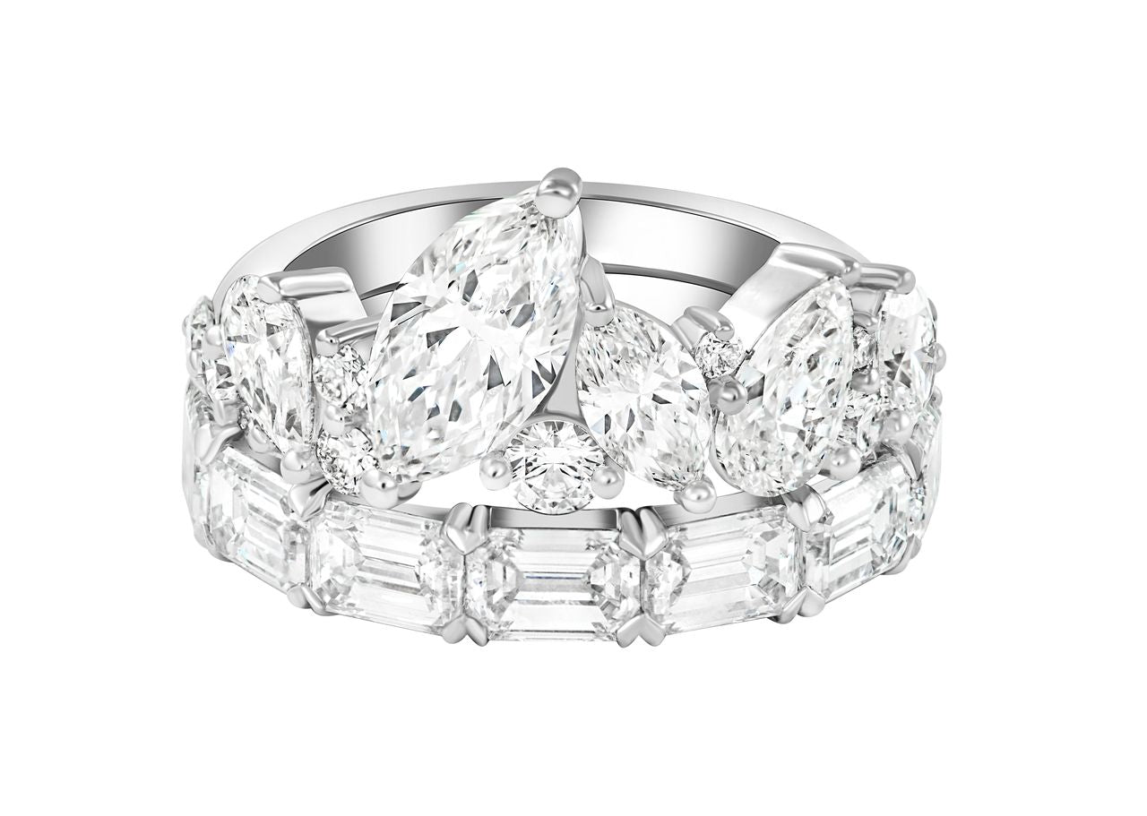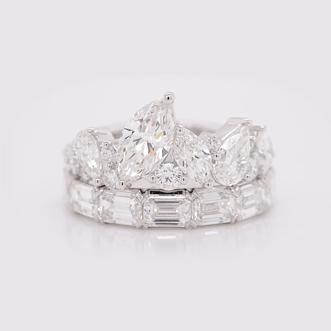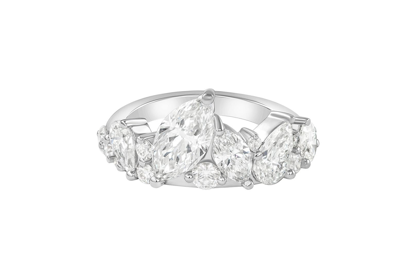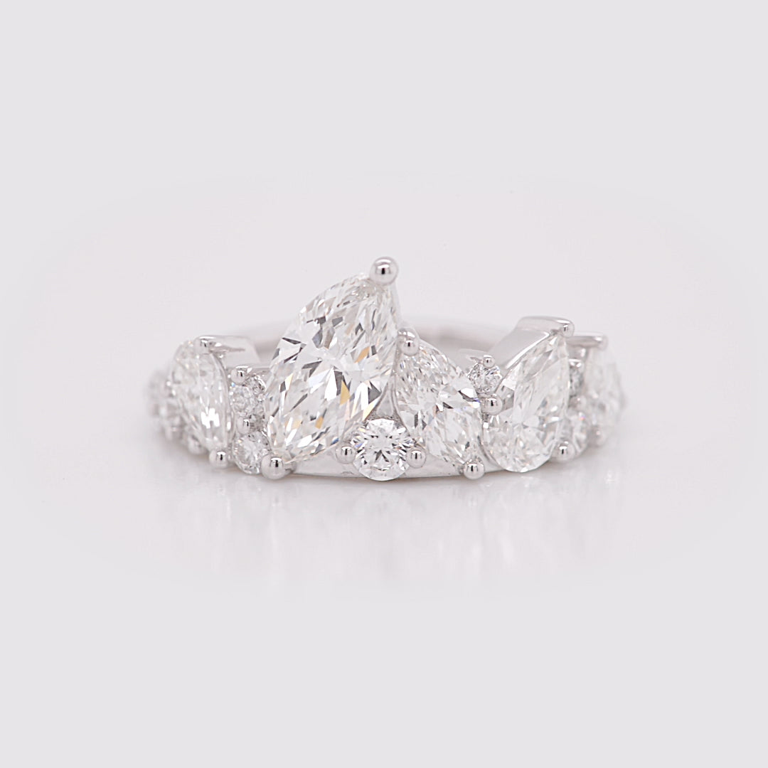 Make a striking statement with The Teton Crown Ring, meticulously crafted in 18K white gold and designed to dazzle from every angle. Sixteen diamonds create a luminous foundation, crowned by a pear-shaped diamond and a marquise-cut diamond.