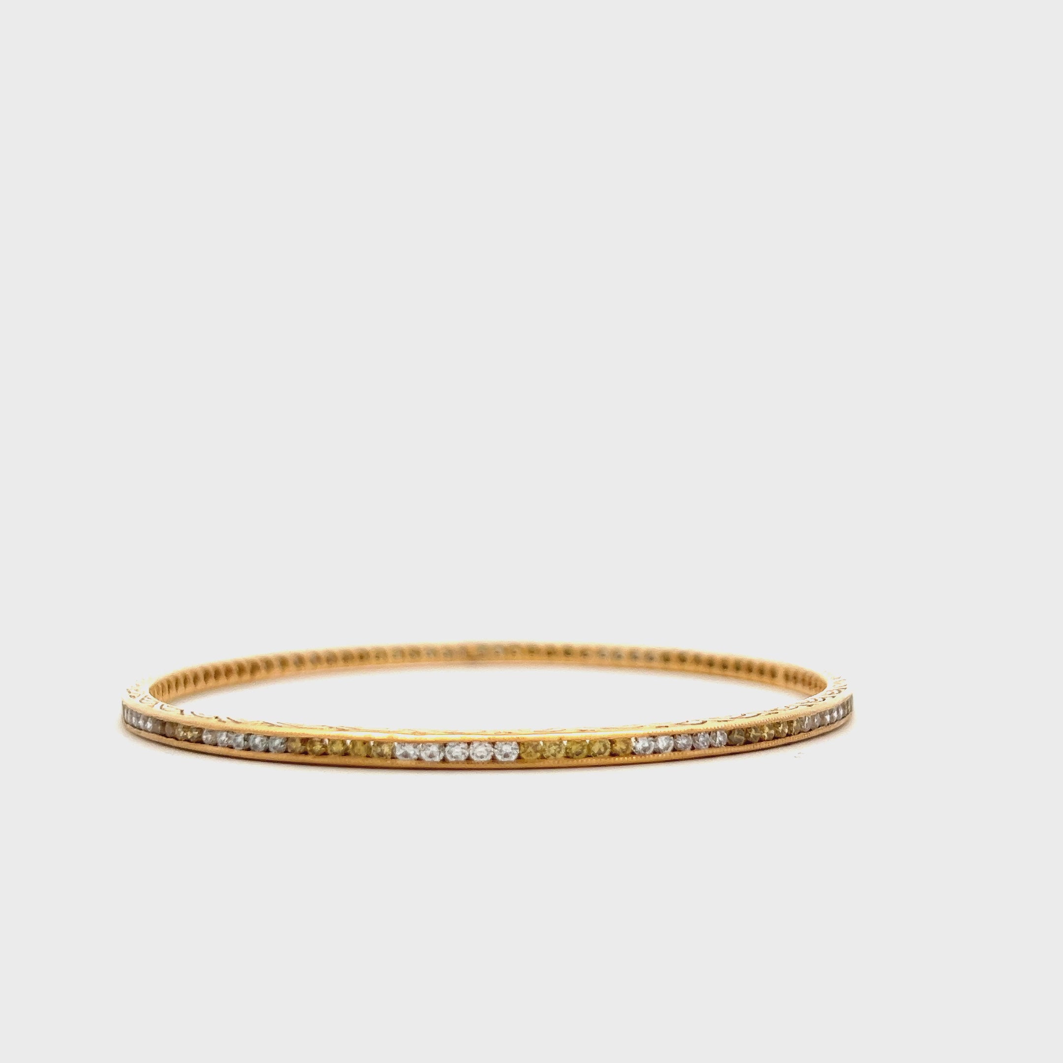 Indulge in the luxury of Vivaan's 18K yellow gold bangle, adorned with white and yellow diamonds. Elegant and exclusive, this bangle effortlessly adds sophistication to any outfit. With its exquisite design and premium materials, it's truly a piece of art for the fashion-forward.