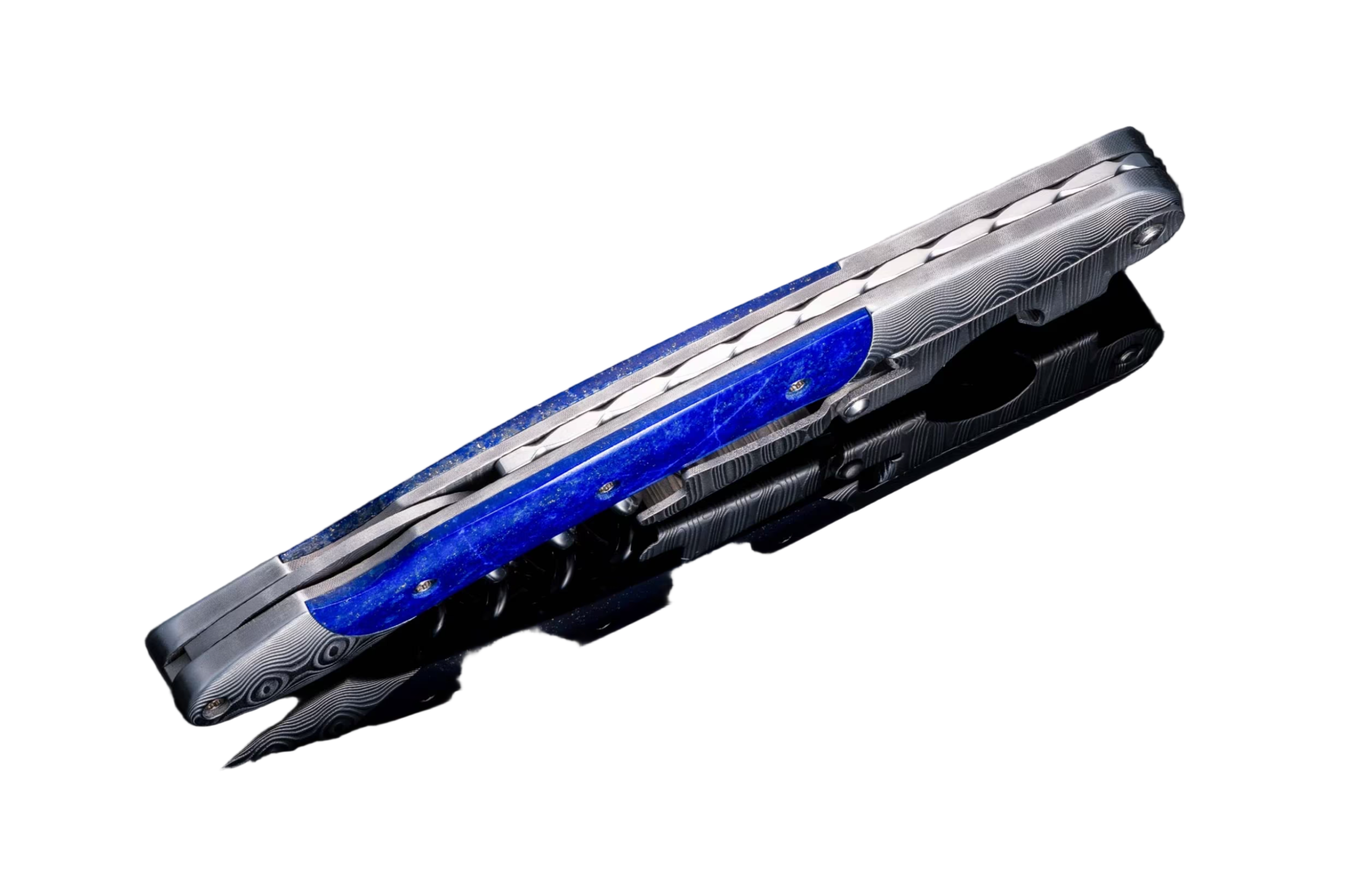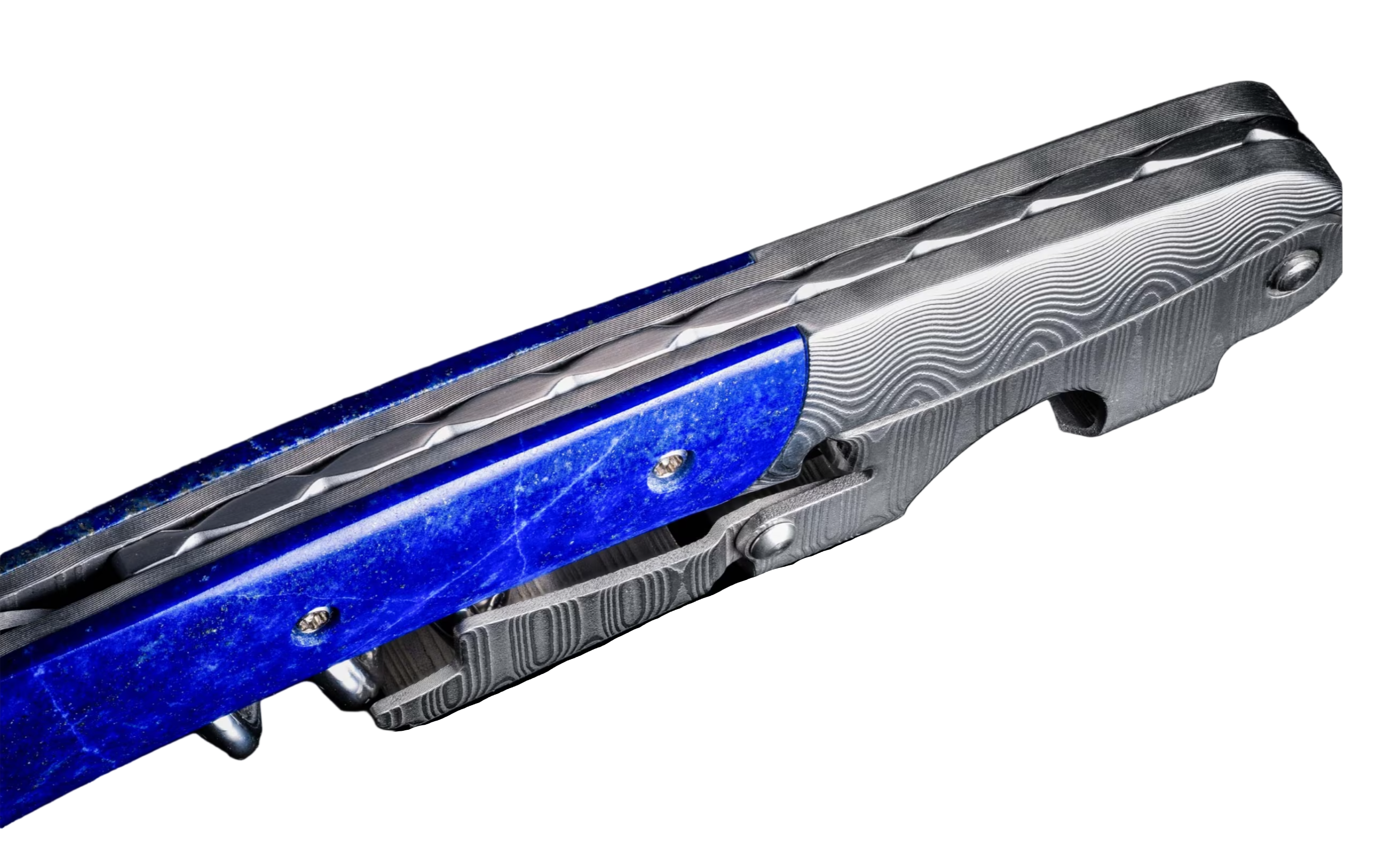 Accented with a striking Lapis Lazuli inlay, this piece pays homage to one of the world’s most treasured stones, celebrated for its deep celestial blue and golden flecks of pyrite. Meticulous file work along the entire spine demonstrates William Henry’s unmatched attention to detail, making the Blue Hour as much a conversation piece as it is a functional tool.