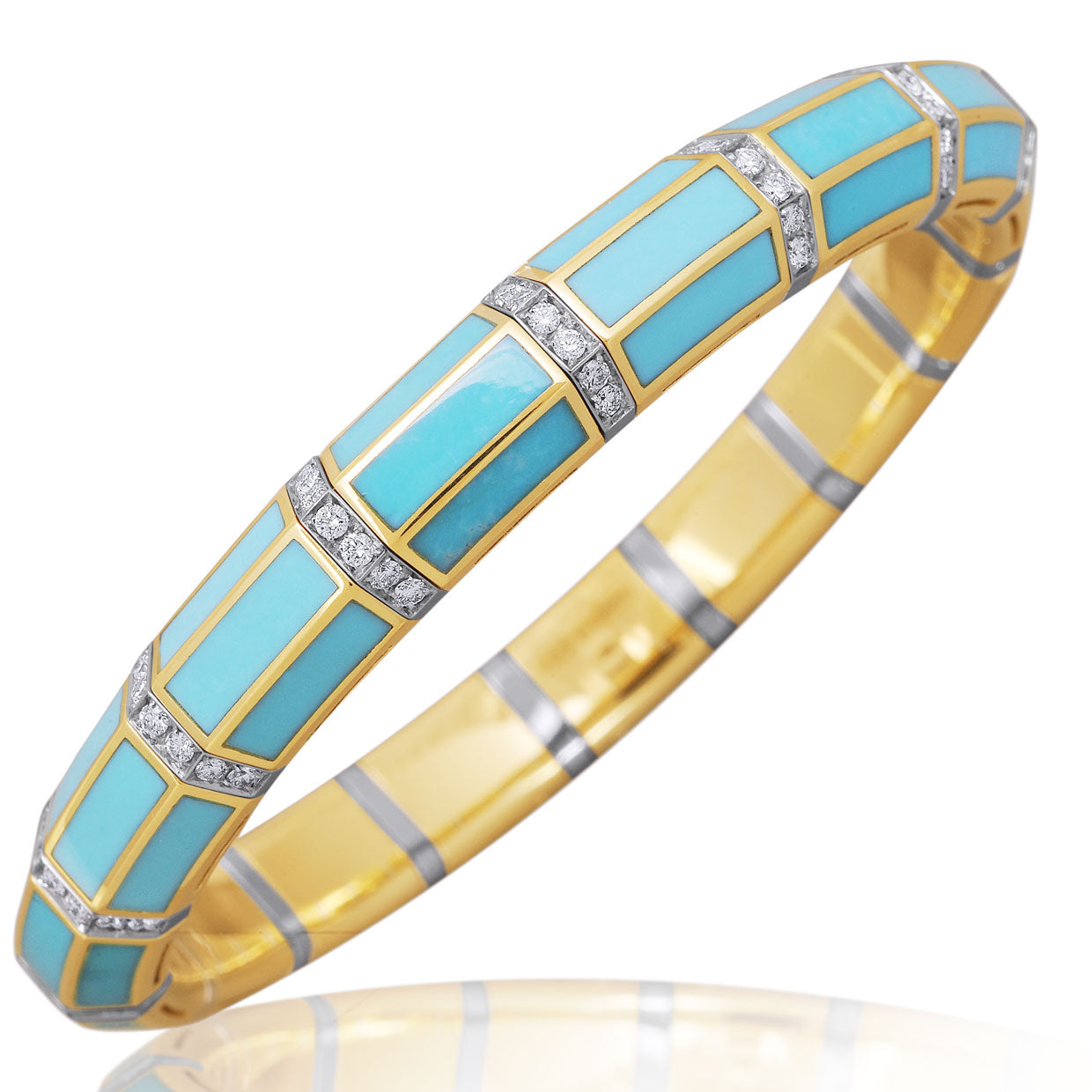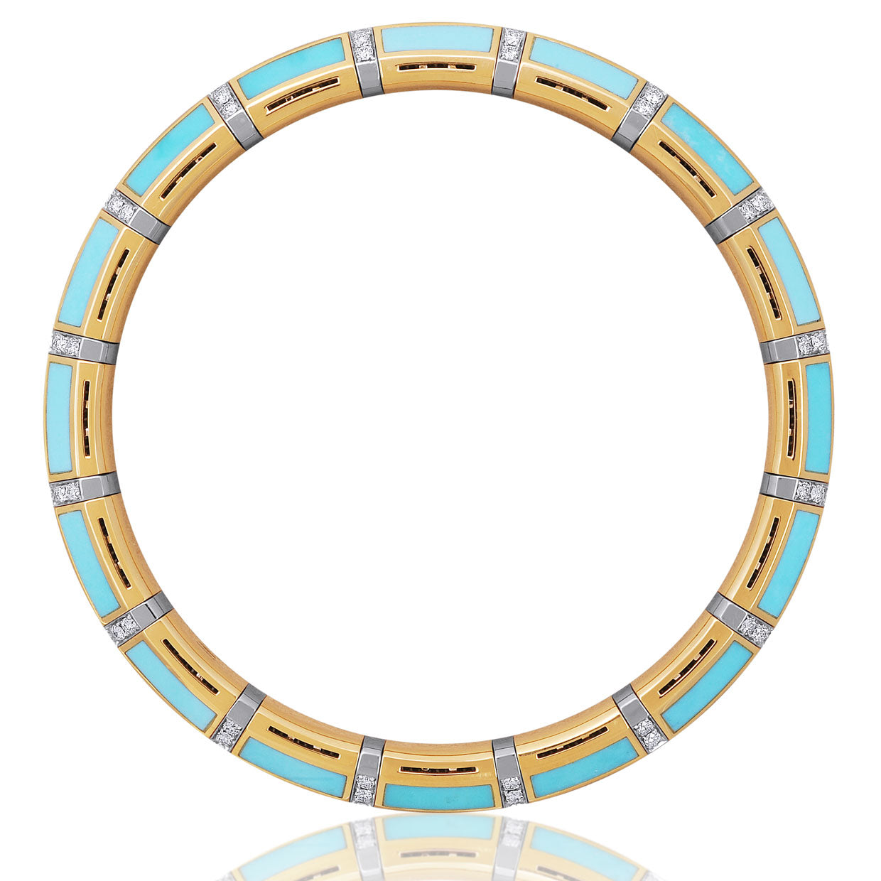A bold yet refined piece that blends vibrant gemstones with Italian engineering. The smooth turquoise contrasts beautifully with sparkling diamonds, delivering comfort, flexibility, and standout design. A collector-worthy jewel for day or evening elegance.